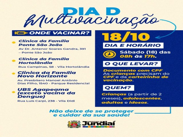 Das 8h às 17h, estarão abertas a Clínica da Família Ponte São João (avenida Dr. Antenor Soares Gandra, 391), a Clínica da Família Novo Horizonte (avenida Presbítero Manoel Antônio Dias Filho, 1540), a Clínica da Família Hortolândia (rua Campinas, 58) e a Unidade Básica de Saúde (UBS) Agapeama (rua Luis Carpi, 238). Todas as vacinas previstas no Calendário Nacional de Vacinação estarão disponíveis. Na UBS Agapeama só não será aplicada a dose contra a dengue.