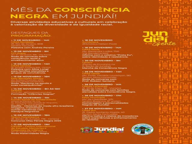 As ações do Mês da Consciência Negra seguem até o final de novembro, com atividades culturais, rodas de conversa, formações e vivências em diferentes territórios do município, confira: